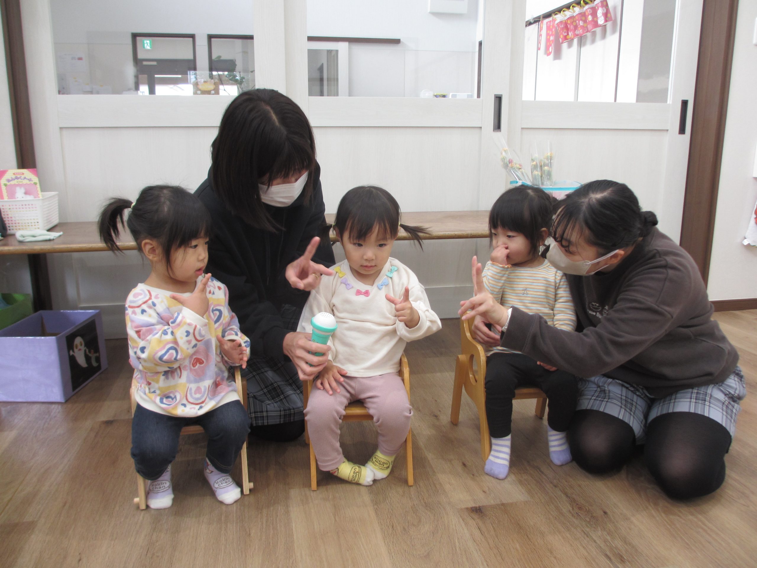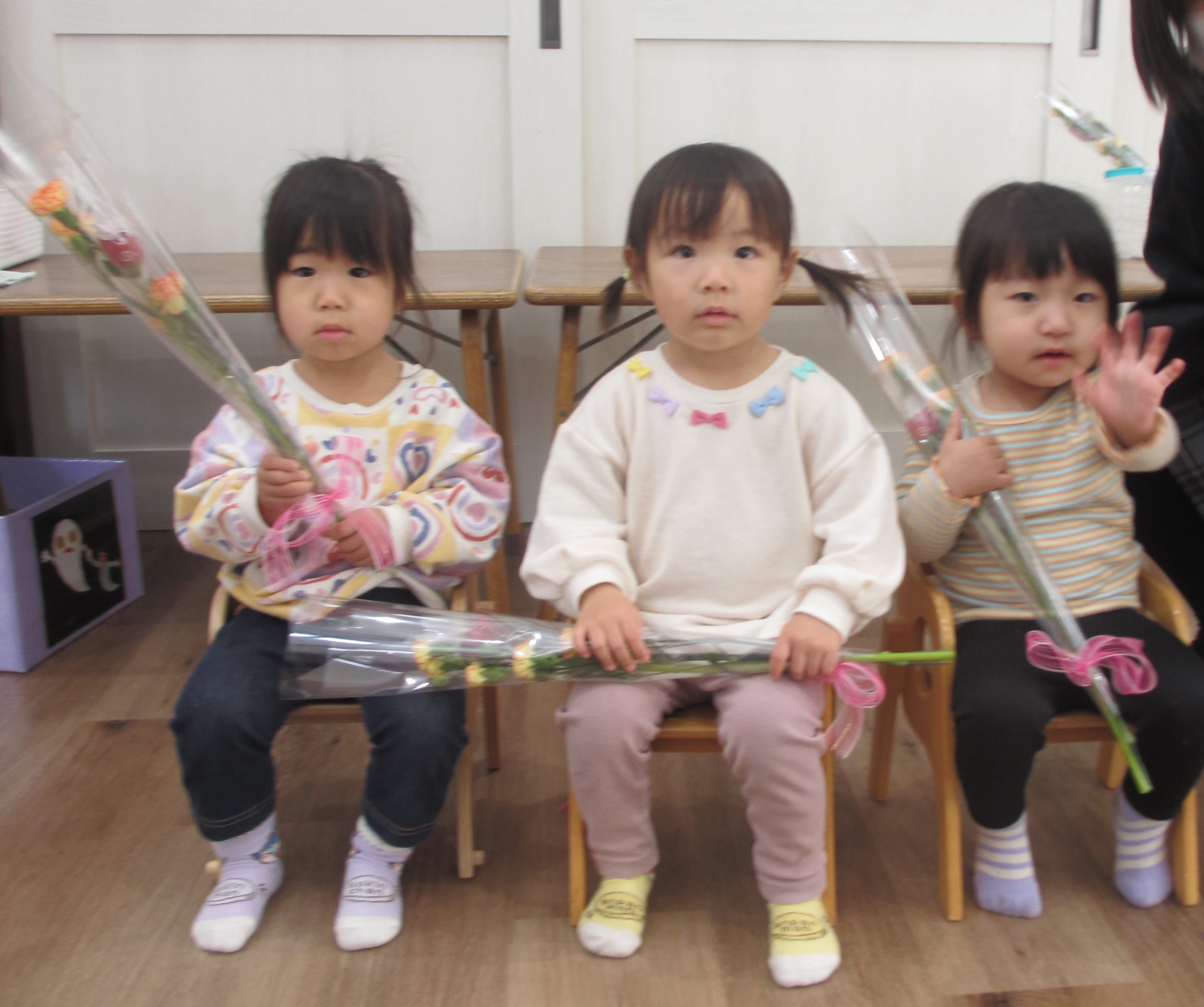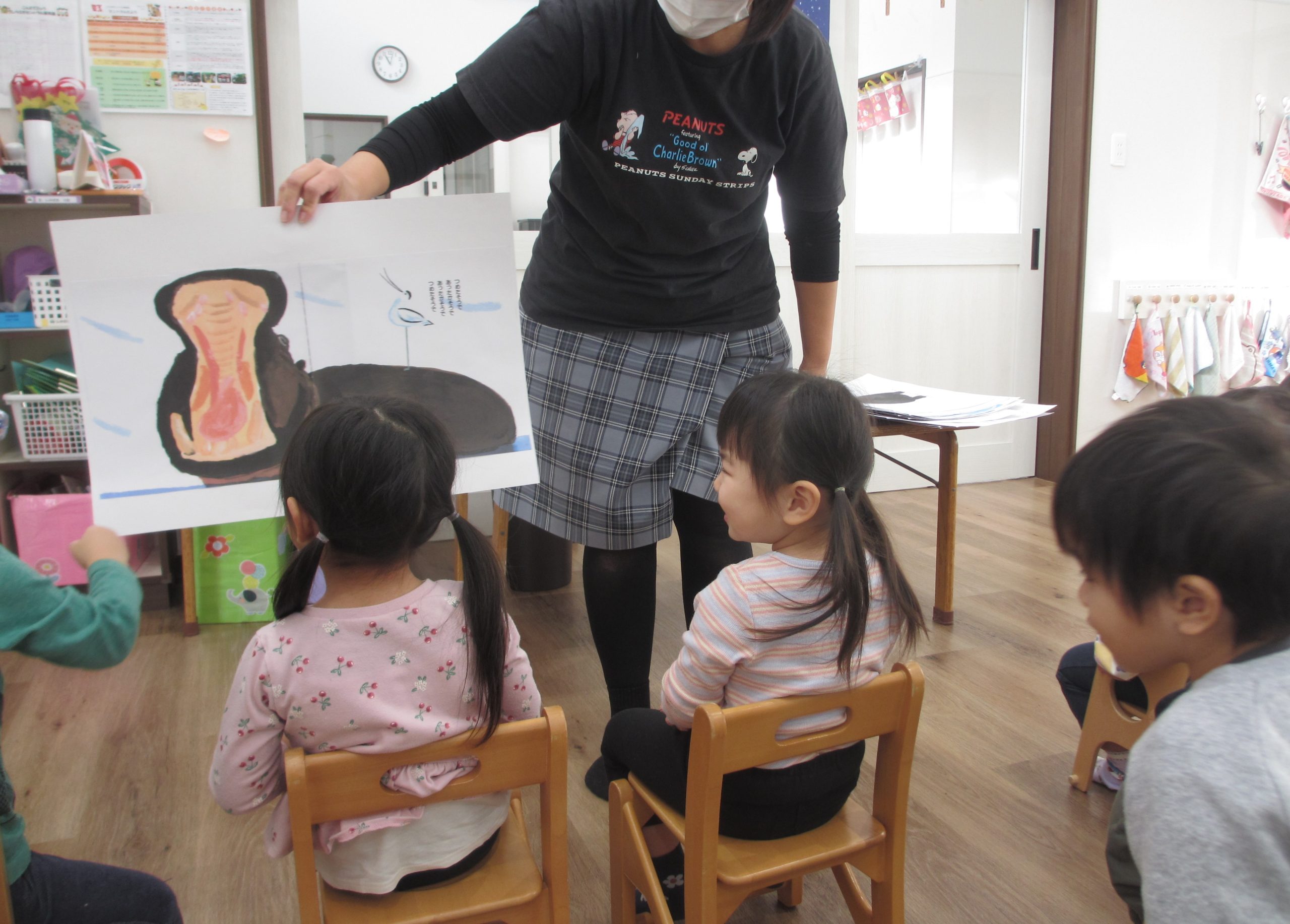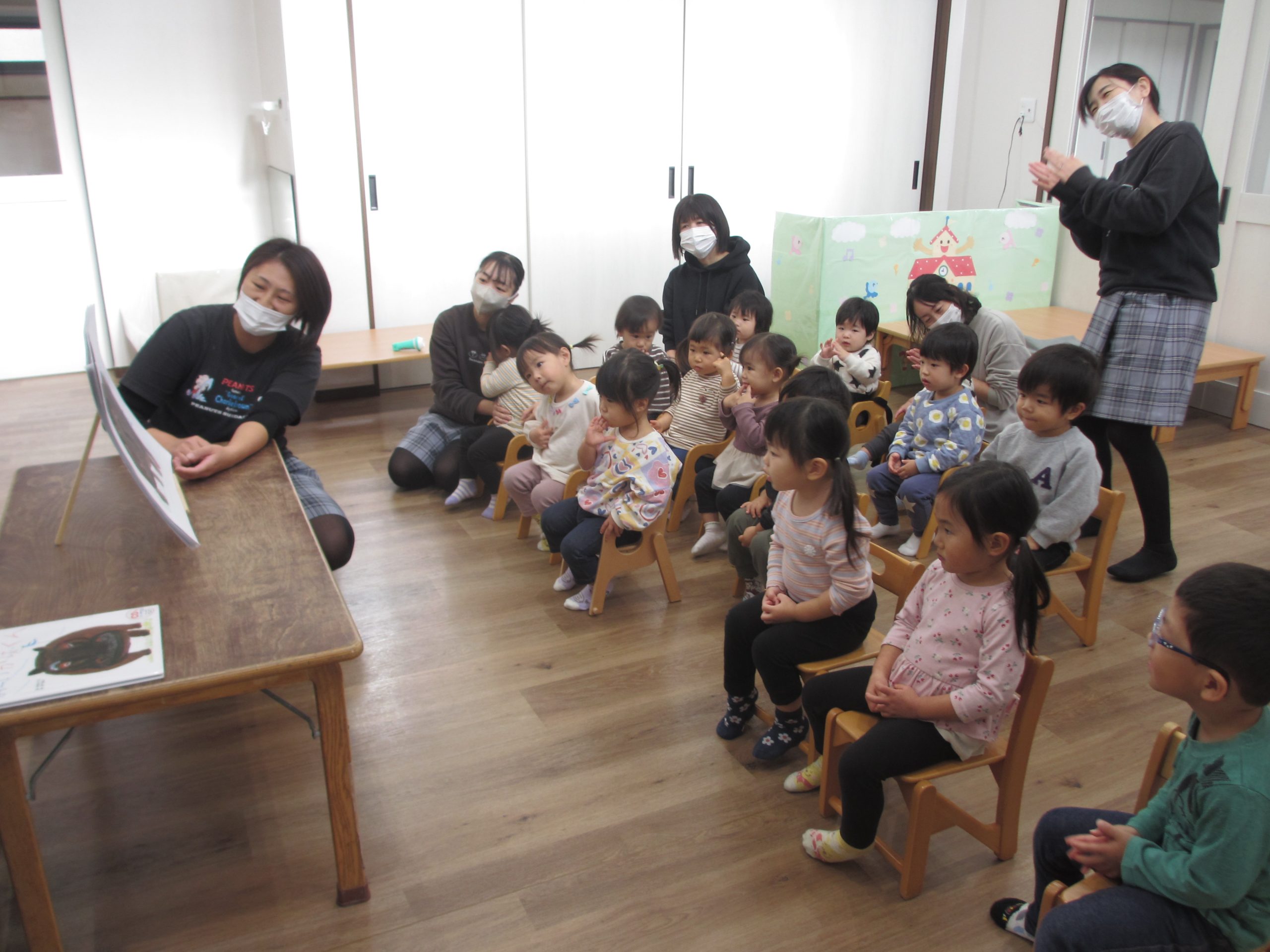 誕生会【11月】 日々の様子 2025.11.27 今日は、11月生まれのお友だちの誕生会を行いました。 お花のプレゼントやみんなでハッピーバースデーの歌を歌って、誕生日のお友だちのお祝いをしました。 「おーいかばくん」の絵本を見ました。 かばくんの大きなおしりやお口にも興味津々な子どもたち。 音楽にのって体を揺らして楽しんだり、手を叩きながら絵本を楽しむ姿がみられました♪ 11月生まれのお友だち、お誕生日おめでとうございます☆
